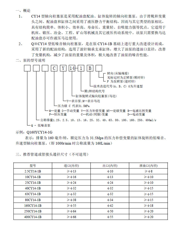 變量柱塞泵40YCY14-1B型號含義:排量為40毫升/轉、額定壓力31.5Mpa的壓力補償變量缸體旋轉低噪音,升速型